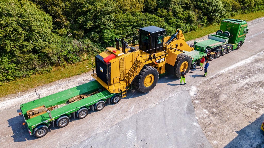 Transporting an 80-tonne Cat 990 wheel Loader 4.5 m wide and 5.4 m high from the Netherlands to Denmark is a great challenge. The first part of the journey took place by water and the later transport from Esbjerg to Aggersund Kalkværk via Løgstør by road was challenging.